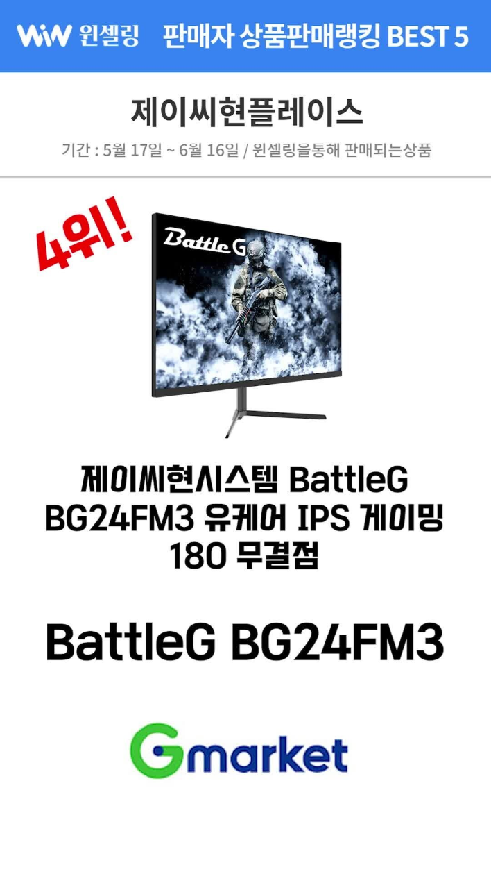 4위 제이씨현시스템 BattleG BG24FM3 유케어 IPS 게이밍 180 무결점