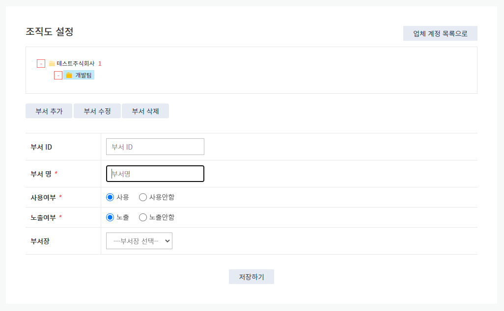 - 부서 등록 항목: 부서 ID, 부서명, 사용여부, 노출여부, 부서장 설정 가능
